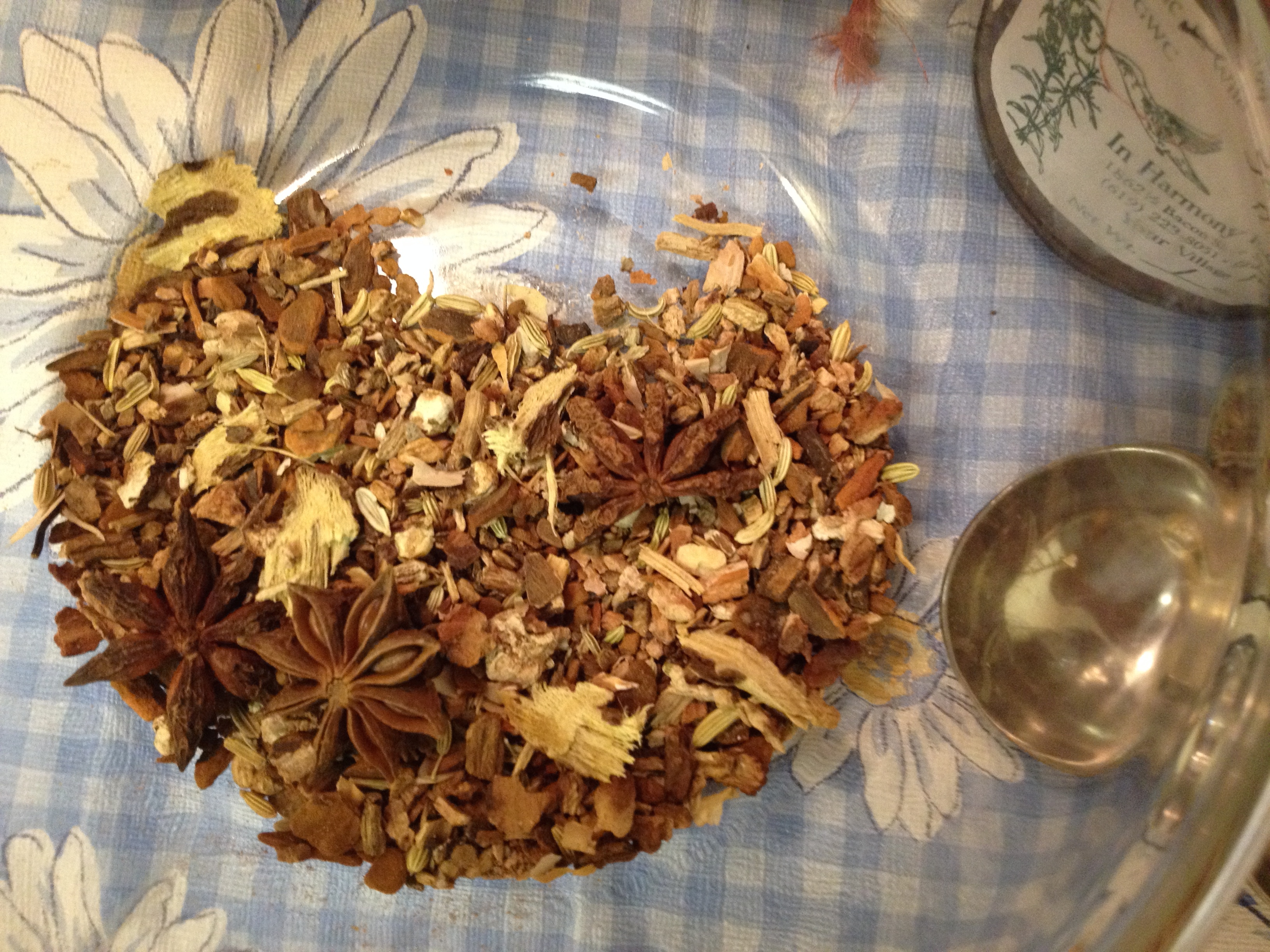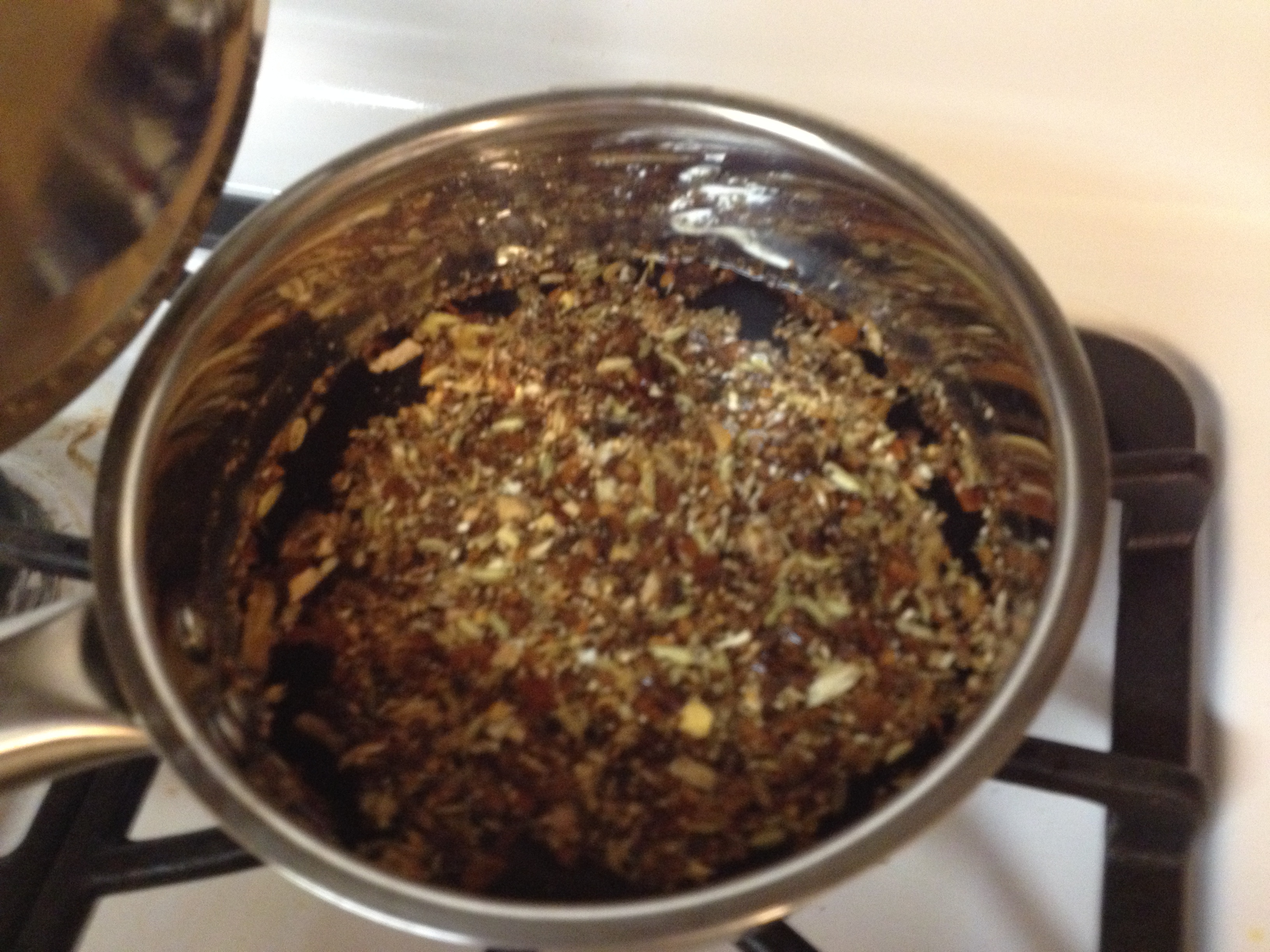Photographed above are all the herbs I used: dandelion root, burdock root, star anise, birch bark, sassafras root, licorice root, sarsaparilla root, and fennel seeds. The recipe is given in “parts” and my “part” was a teaspoon. Three teaspoons equals a tablespoon.